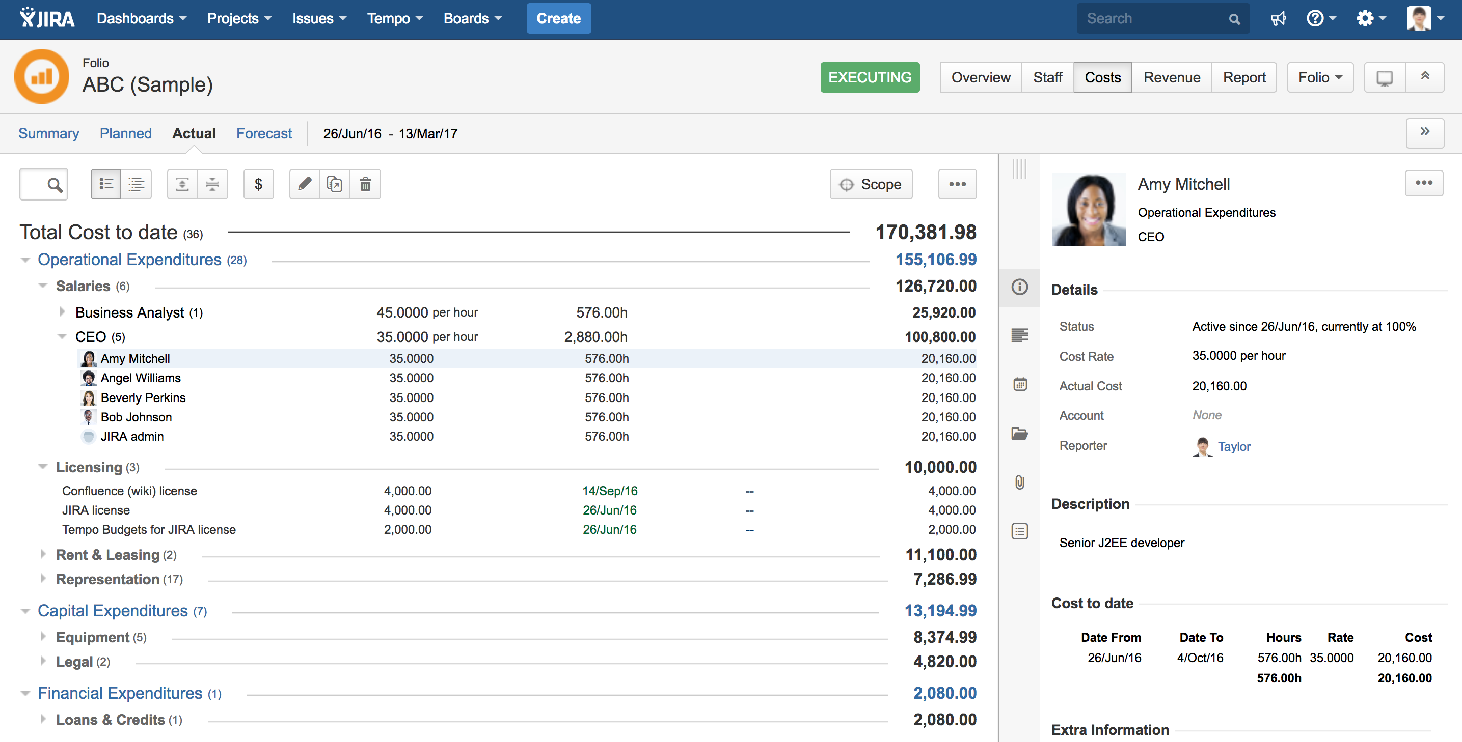 The Actual page shows the calculated actual cost for each team member and team member groups (by title) to date. The actual cost of a team member is calculated based on her worked hours and her (possibly varying) cost rate.