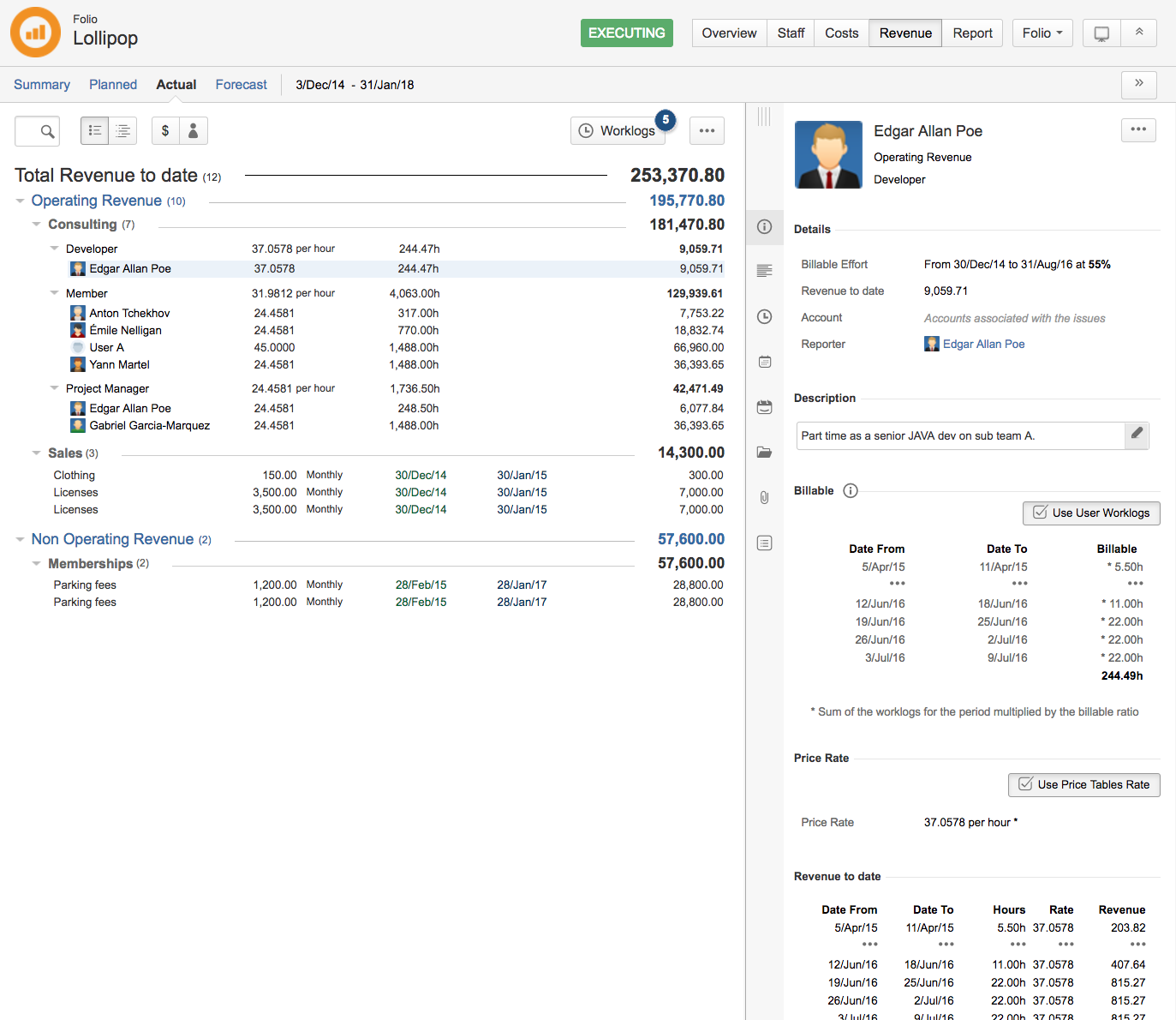 Consulting revenues are the actual revenues from billed worked hours that the Folio generates. They are operating revenues. Consulting revenues are grouped by title (e.g. Developer, Architect, Q&A). You can collapse (or expand) a group of consulting revenues by clicking the triangle icon (UNKNOWN ATTACHMENT UNKNOWN ATTACHMENT) next to a consulting revenue role.
