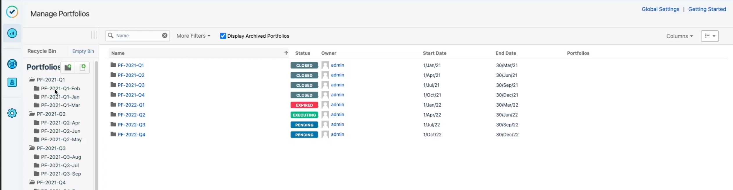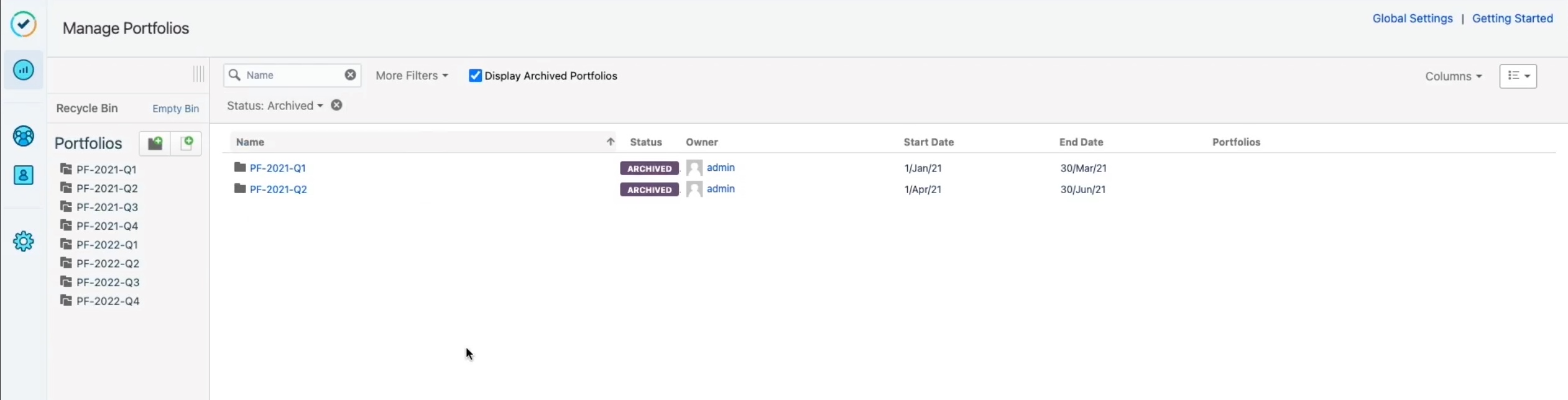 - To display all archived portfolios in the table, click to check the Display Archived Portfolios. All archived portfolios and sub-portfolios appear in the table.