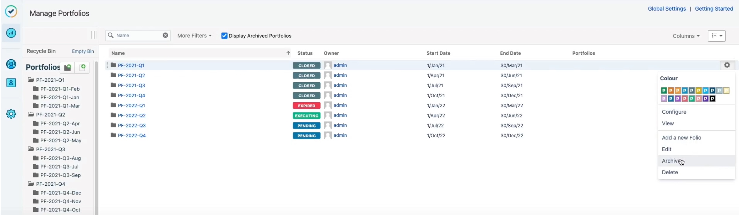 - Hover over a portfolio in the table and click Archive in the Cogwheel, for the selected portfolio.