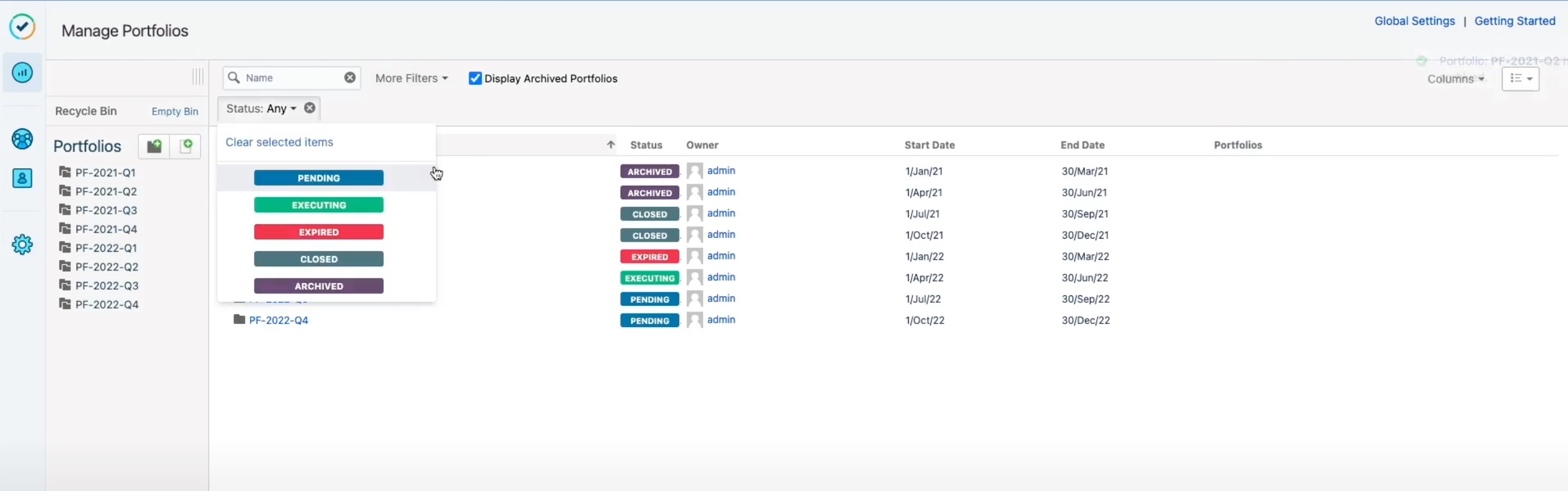 A filter that excludes Archived status can still return archived portfolios. Filters take into consideration the status prior to archiving and can return archived portfolios that match that status. For example, when filtering with Closed status, archived portfolios that were closed prior to archiving will match the criteria.