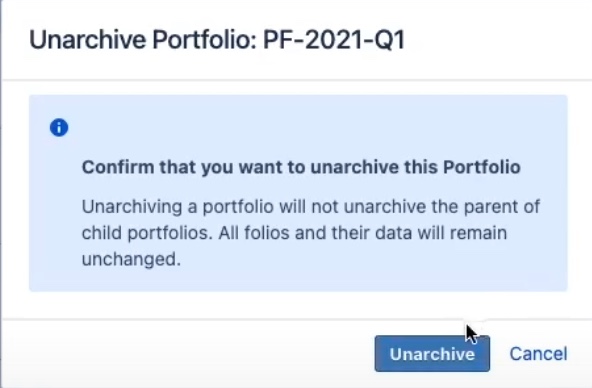 Unarchiving a parent-level portfolio does not necessarily unarchive the sub-portfolios in the parent-child hierarchy, nor does an unarchived child sub-portfolio changes the archived state of the parent portfolio when all sub-portfolios are unarchived in the hierarchy.