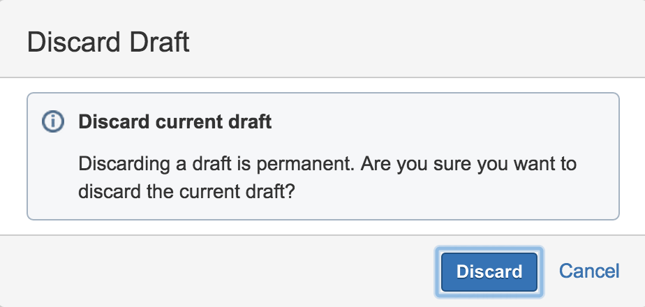 If you have edit rights on the current Folio, you can discard the draft. When discarding the draft, all changes made since the latest baseline (all data if no baseline have been set) are permanently deleted and the view is automatically switched to the latest baseline (if any). To discard the draft you must first be in Draft mode, then open the action (...) menu and select the Discard Draft item. This brings up a confirmation dialog to confirm the operation. Click the Discard button to confirm the deletion of changes.