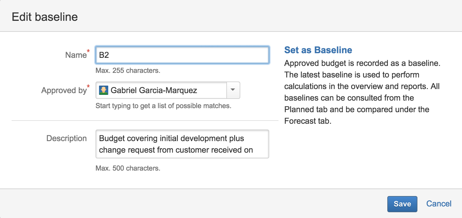 Approved by | A JIRA user who approves the current budget. Only the owner of the Folio and this approver will have the right to delete or edit the baseline later. |