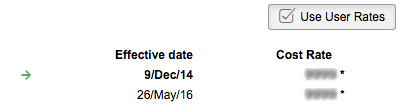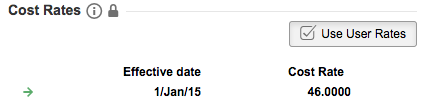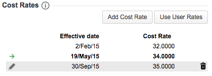The rates in the Cost Rates section are sorted by their effective date. Each cost rate holds two pieces of information: an effective date and an hourly amount. Each team member must have at least one cost rate defined.