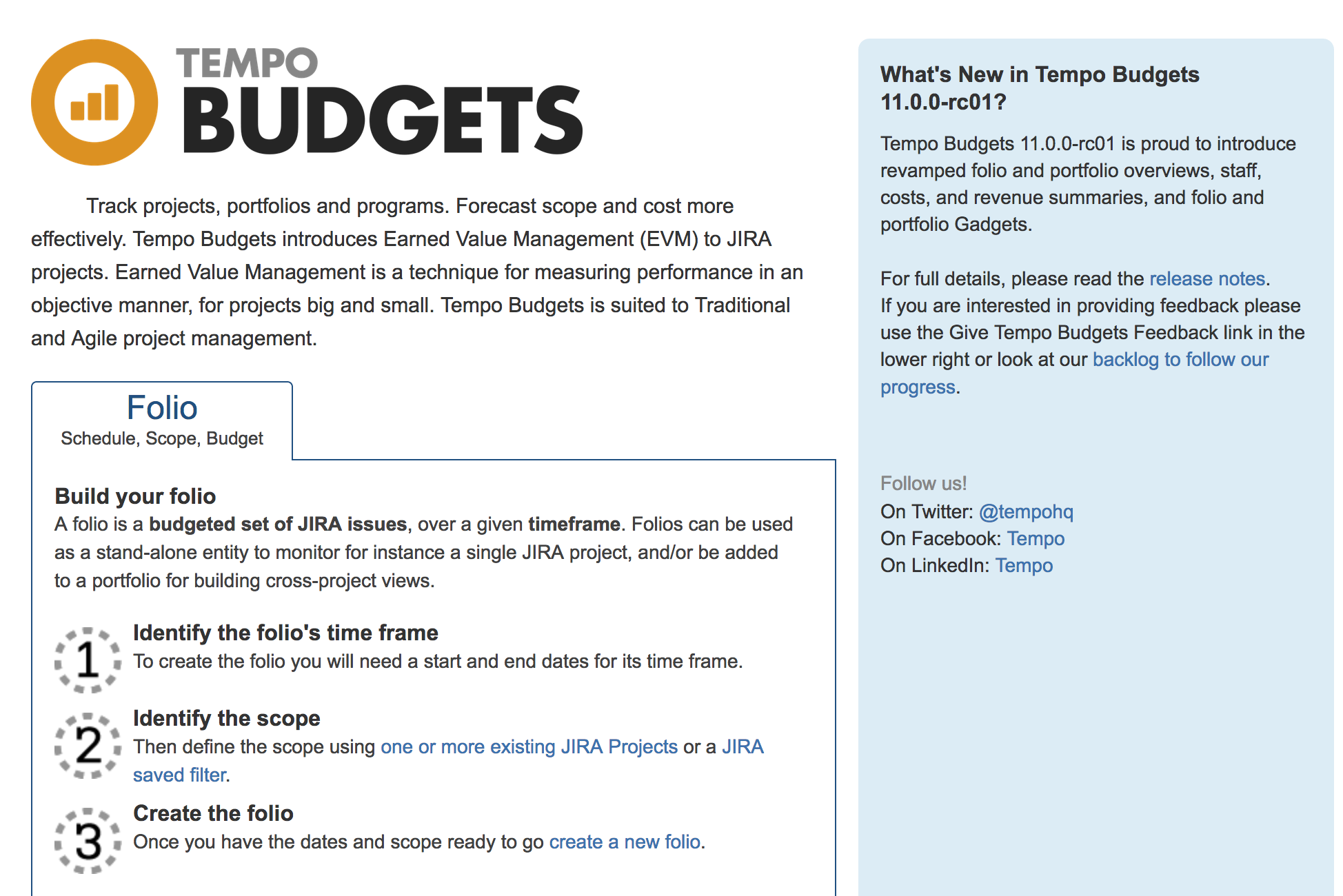 To access the Getting Started page, select Budgets in the Tempo toolbar, or select Tempo > Budgets from the Jira menu bar, then click Getting Started at the top-right of the Manage Portfolios page. From the Getting started page you will be able to create a Folio by clicking the Create a new folio link. This page gives you access to the user documentation, the latest release notes and many other useful links and information.