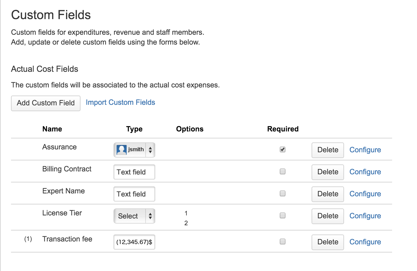 Custom fields can be added to Actual expenses and revenues and staff members. Their value can be set in the edition dialogs of the related entries. Once a value is set, it will show up in the detail column on the right when the entry is selected, as well as in the Excel Export of the Expenses/Revenues Report. You can define as many custom fields as you want for each one.