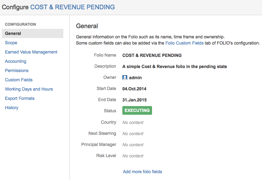 If you defined Folio custom fields in the Global configuration they will be added below the Folio Status like example fields 'Country' and 'Department' as shown in the screenshot above. You can add new custom fields by clicking on the add more fields link