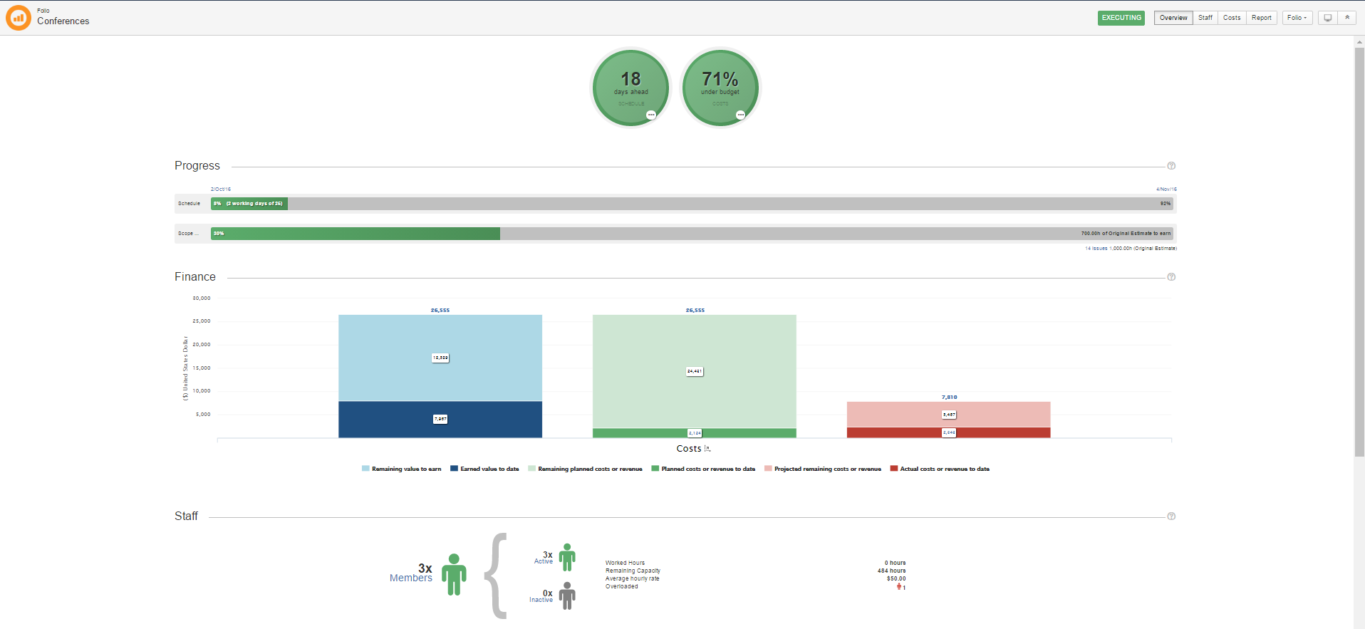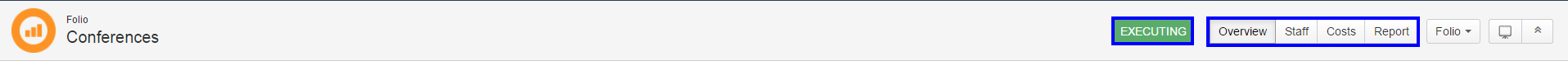 The Header of the page provides you with the name of the selected folio and its status (Pending, Executing, Expired, Closed) and lets you access detailed information on its associated staff, costsand availablereports.