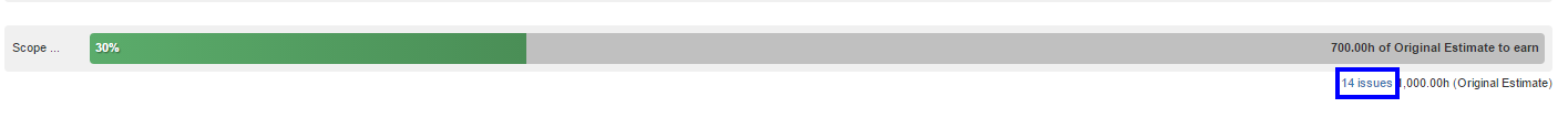 The Scope progress bar displays the completion ratio. The completed ratio indicates how much value was earned to date versus the project's total planned value. It is computed by dividing the earned Original Estimate to date by the total sum of the Original Estimate to earn. You can click the Scope bar to view information on the Resolved and Closed issue types related to the project (Stories, Epics, Tasks, etc.)