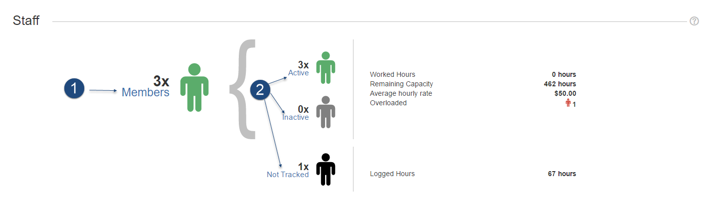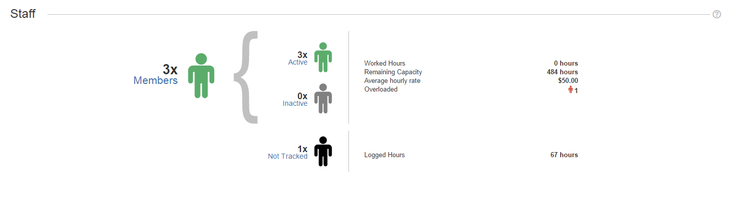This section is collapsed by default. Click the arrow next to the title to expand it. The Staff section gives you an overview of the current states of this portfolio's staff. The staff activity status and remaining capacity is based on each member's specified availability.