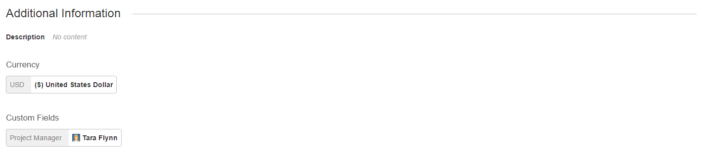 The Information section provides you with additional information on the folio (for example: the currency used, the Project Manager, etc.) and lets you enter a description by clicking inside the Description field.