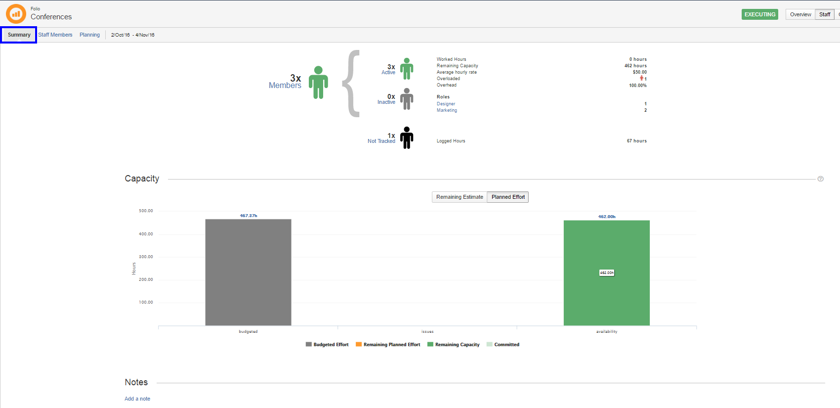 The Folio Staff Summary provides you with an overview of the current state of this portfolio's staff. The staff activity status and remaining capacity are based on each member's specified availability.