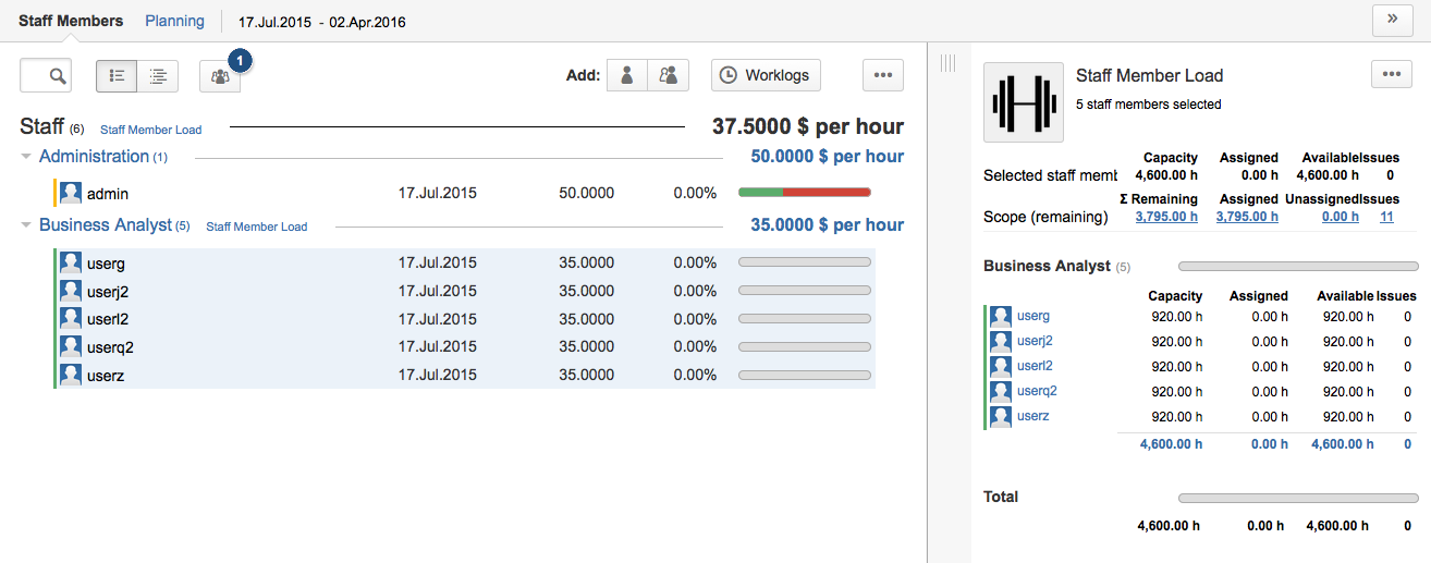 Selecting multiple staff members in the staff browser brings up a Resource load inspection panel on the right. The Resource load inspector brings you a lot of visual information on about the workload of the selected members and provides quick links to their current work assignments.