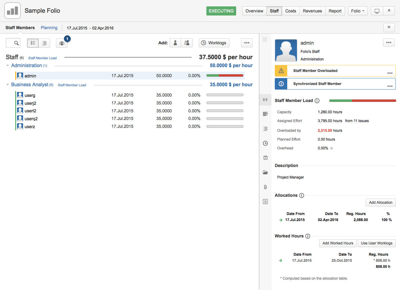 Staff members are Jira users who actively work and record hours on the Folio's issues ( Folio Scope ). Each staff member row in the staff browser shows the following information: