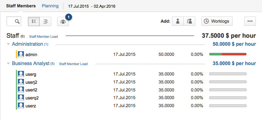 The current average cost rate is shown for the overall staff members and for each role, at the right of each group. These average cost rates are weighted averages of the current cost rates of active members (as determined by their current availability ratio defined in their Availability table), where the weight is the availability percentage. The active members are the members who have a valid cost rate at the present date. Unassigned positions are not taken into account when calculating average cost rates.