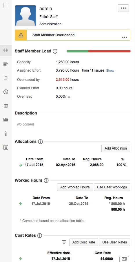 Weekly Schedule | Weekly Schedule of the staff member. Refers to a Tempo Workload Scheme indicating the number of normal working hours per weekday for that person. Workload Schemes can be defined at various levels, namely: Tempo Team member, JIRA user, Folio, Global Folio Configuration, Overall Default. |