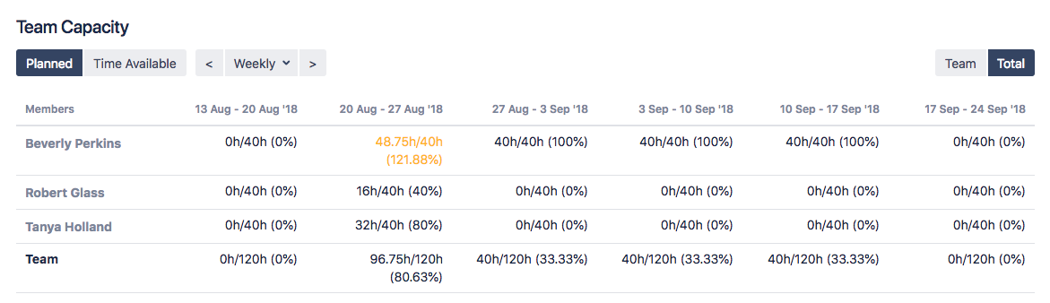 Now you can see that Beverly is actually over-committed for week 34 because she's also working for another team. The time for over-committed team members shows up in yellow.
