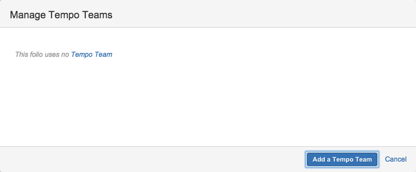 To use a Tempo Team in a Folio, go to the Folio's Team page by clicking the Team button in the navigation bar located at the top right of the screen, then click the Actions (...) button at the top right of the Team browser panel and then select Manage Tempo Teams. This opens the Manage Tempo Teams dialog, which looks like the following when no Tempo Team is currently used by the Folio.