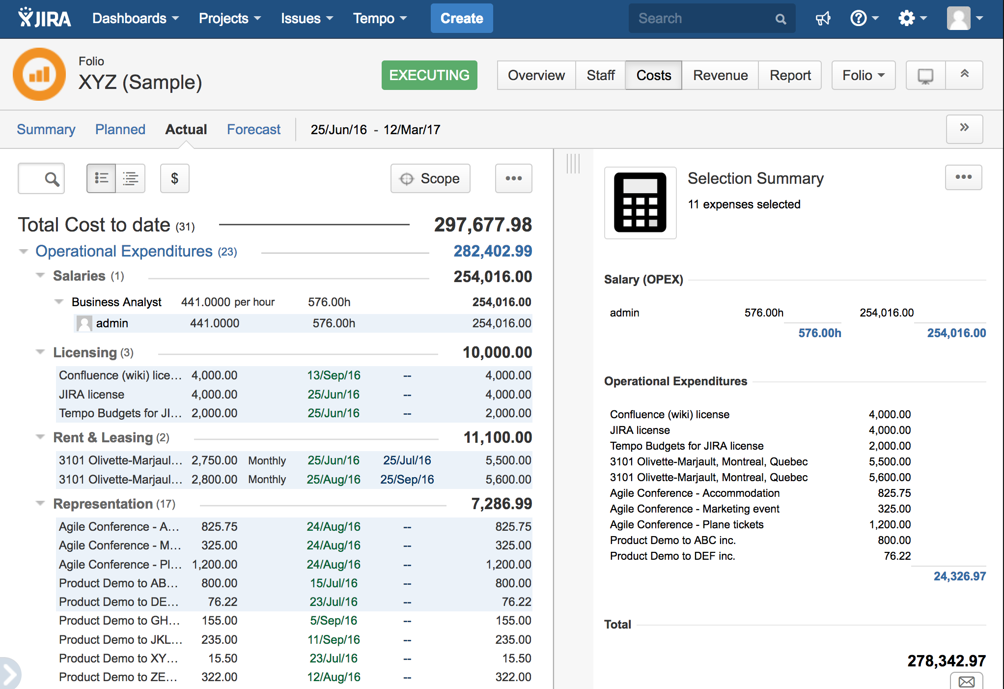 Folio and Portfolio screens that allow you to explore Costs, Revenues and Team Members also let you select multiple elements at once to display group information in the details panel. For example, selecting multiple Expenses and Positions in the Planned Costs shows a summary of the total planned value of selected items.