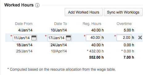 To manually edit overtime hours, click on the Worked Hours row table you want to edit. Submit your changes by typing return or by clicking anywhere in the page. The same validation rules apply than when adding overtime hours.