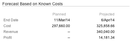 This section shows projections based on future known costs (or revenues). It shows a comparison between planned and projected end dates as well as planned and projected total costs (or revenues) based on future known costs (or revenues).