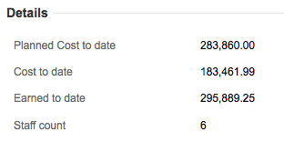 This section displays the Planned Value, Actual Value (Cost or Revenue), and Earned Value to date (if EVM is used). It also shows the current staff count (the number of assigned positions as of today).