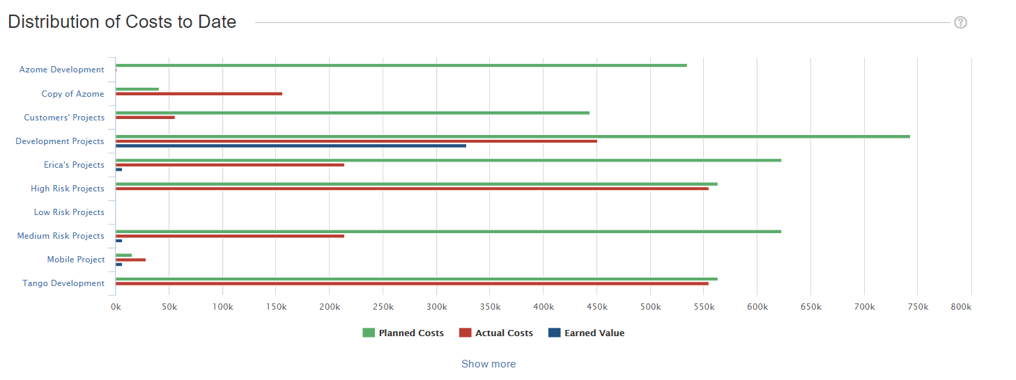This section shows projections based on the past performance. It shows a comparison between planned and projected end dates as well as planned and projected total costs. When using EVM, performance is determined by indices, namely the Cost Performance Index (CPI) and Schedule Performance Index (SPI). When not using EVM, the performance is based on the current completion ratio and actual costs or revenues to date.