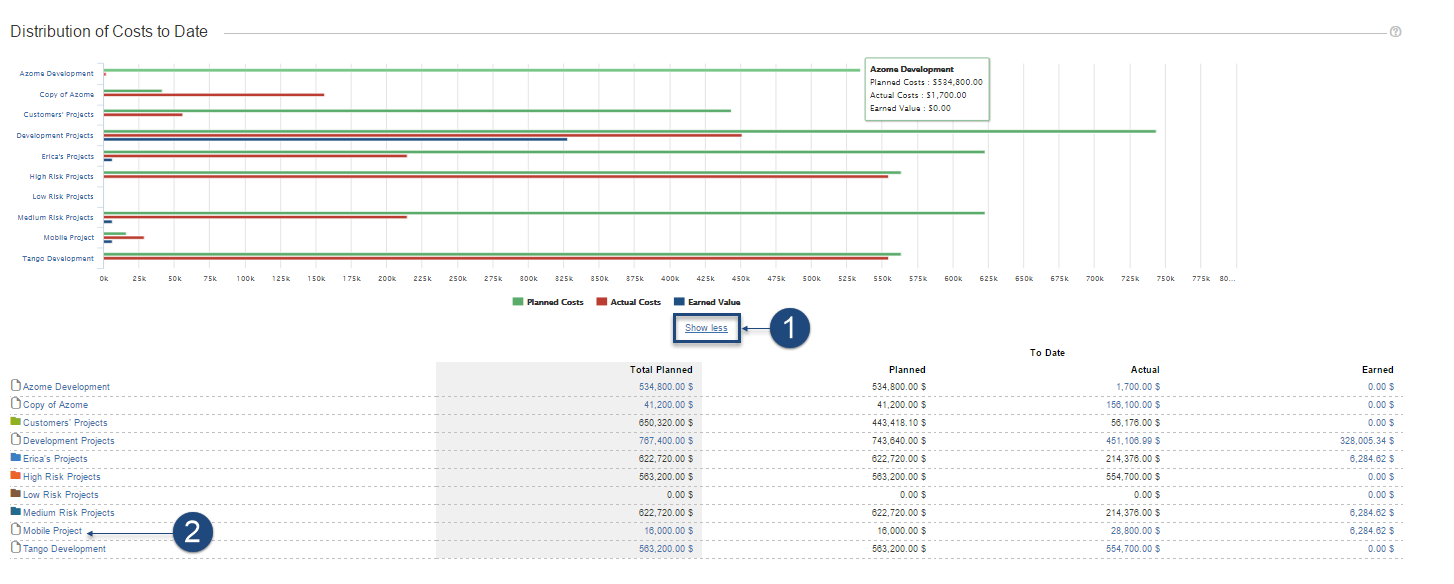 This section displays a chart that puts in contrast each folio in terms of actual costs, planned costs and earned value (if applicable).