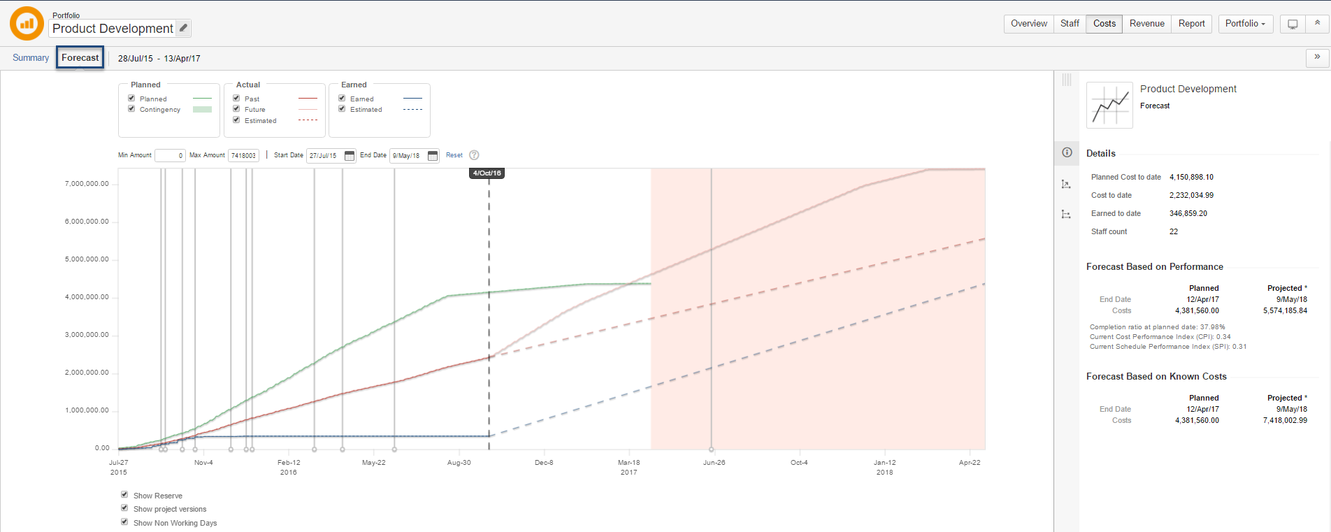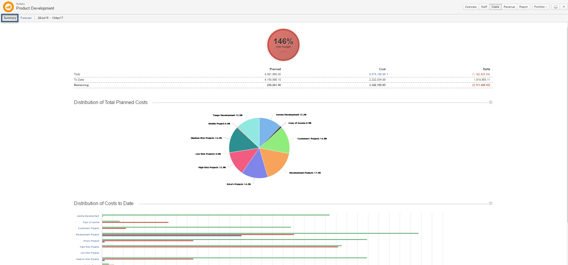 The Portfolio Costs tab lets you plan your project expenses, track them during project execution and obtain future costs forecasts based on your current team's performance. Navigate between Summary and Forecast using the second tab level that appears just below the header when the Costs tab is selected.