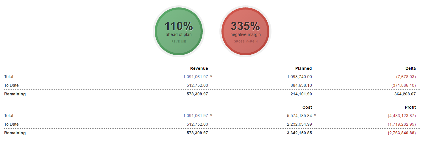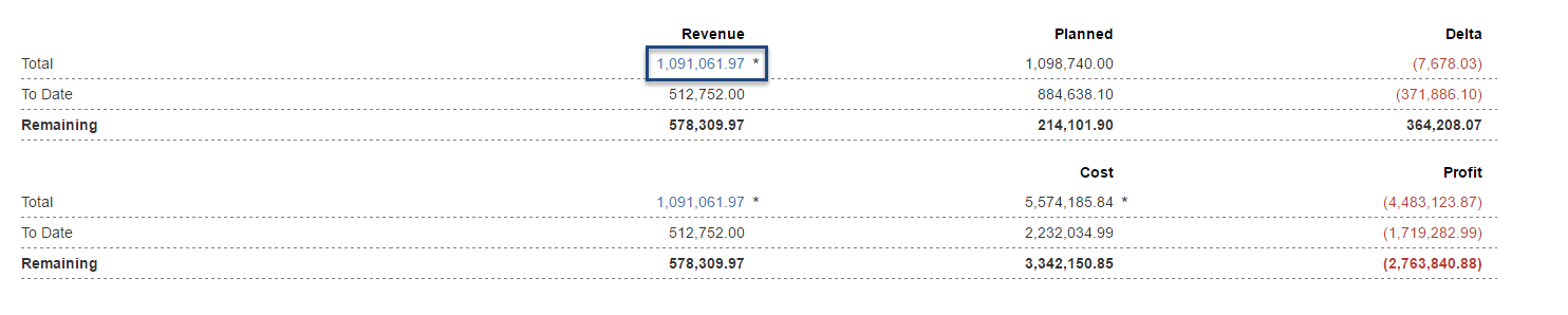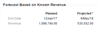 This section shows projections based on future known Revenue (or revenues). It shows a comparison between planned and projected end dates as well as planned and projected total Revenue (or revenues) based on future known Revenue (or revenues) .