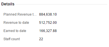 This section displays the Planned Value, Actual Value (Revenue or Cost), and Earned Value to date (if EVM is used). It also shows the current staff count (the number of assigned positions as of today).