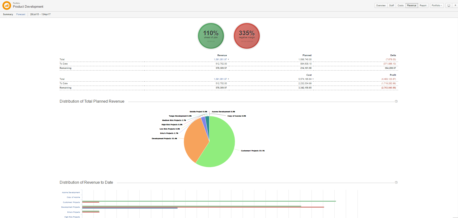 The Portfolio Revenue tab lets you plan your project expenses, track them during project execution and obtain future Revenue forecasts based on your current team's performance. Navigate between Summary and Forecast using the second tab level that appears just below the header when the Revenue tab is selected.