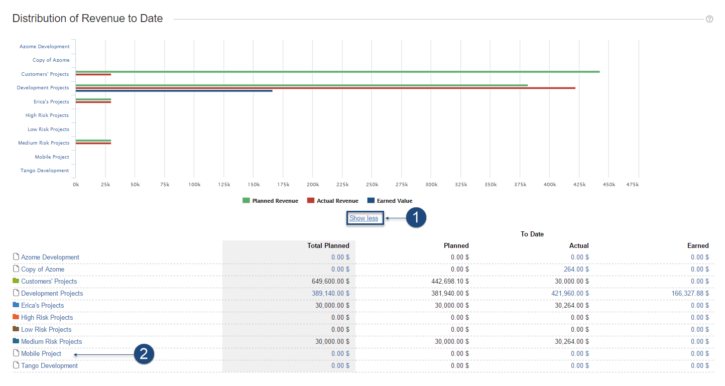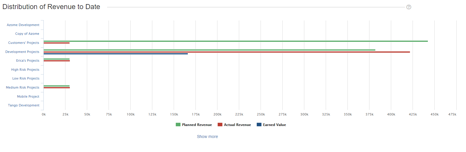 This section displays a chart that puts in contrast each folio in terms of actual Revenue, planned Revenue and earned value (if applicable).