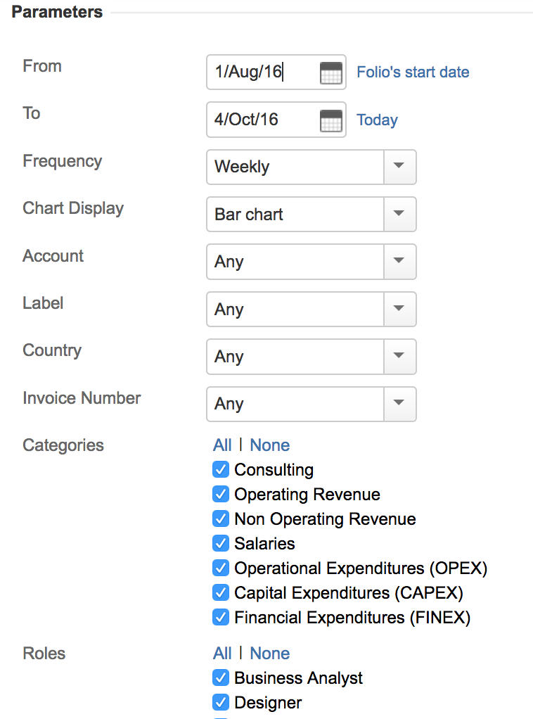 To change the period covered by the report, simply set the dates in the 'From' and 'To' fields to whatever dates you want. The actual period considered will span from the latest of folio's start date and the date entered in "From" field (expenses and revenues defined to occur before the folio start won't be taken into account). You can specify which frequency the report should use to break down the overall period. For example, selecting Monthly frequency will show you revenues and expenses broke down by calendar months. Select "Total" value in the Frequency to get earned value and all expenses for the complete period, with no break down. You can finally limit the revenues and expenses considered to a certain number of types and/or position roles. Simply select/deselect the expense types you are interested in and the report will be instantly refreshed to reflect the new selection. Selecting or deselecting a category will cause the list of available expense types and position roles to be updated accordingly. See the table below for detailed information about report parameters.