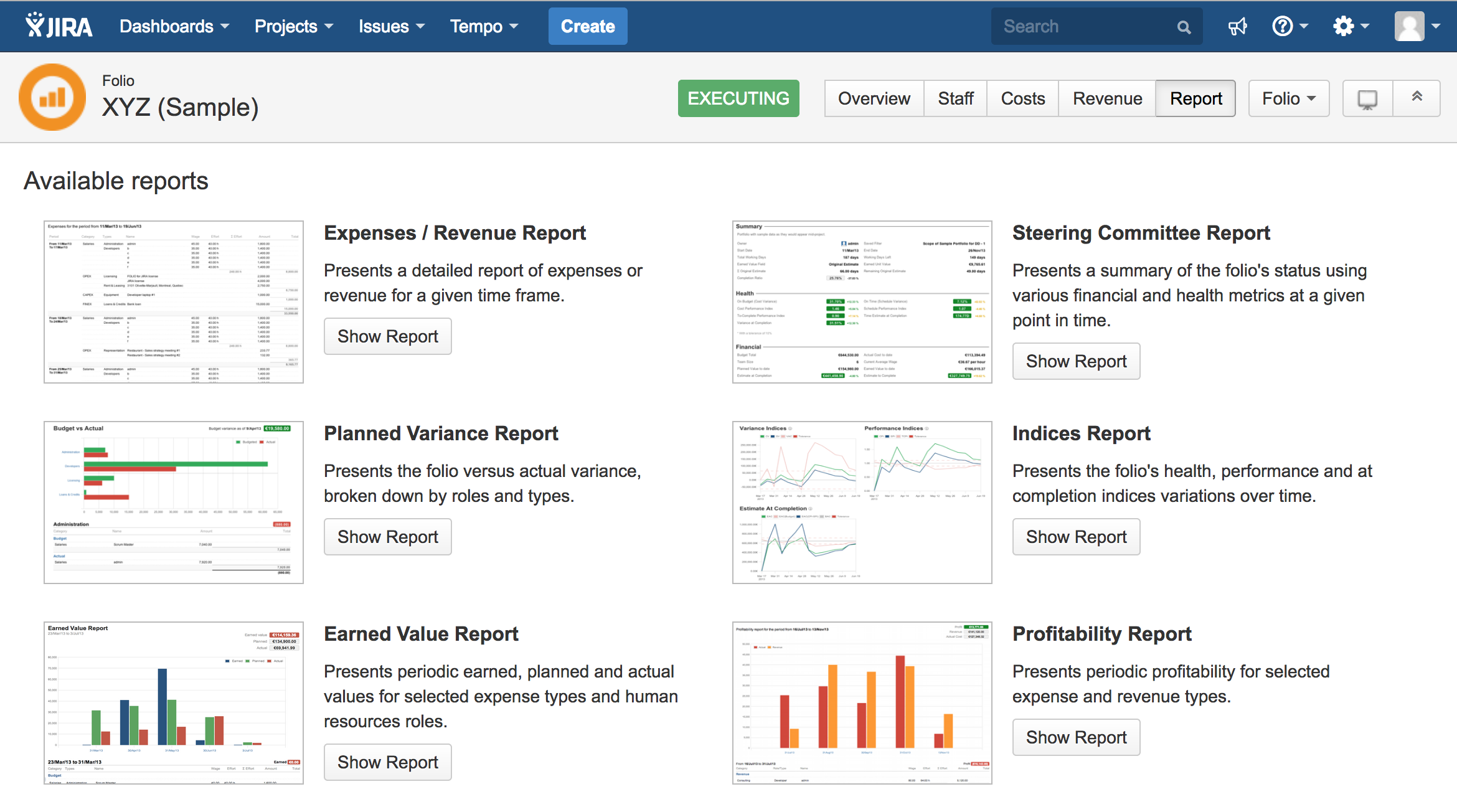 Available reports page