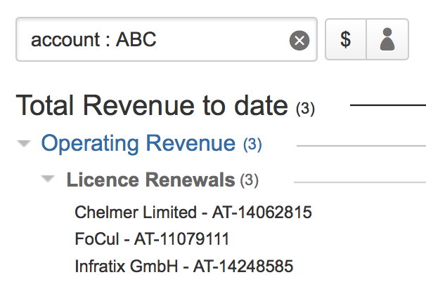 To perform a search by account, start by typing the word "account : " in the search box then type your keyword.
