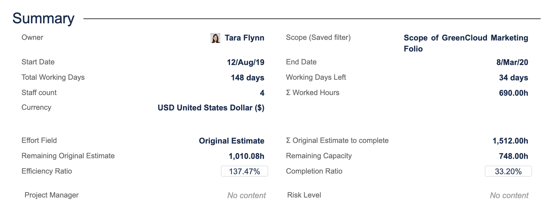 The summary section shows basic folio information such as name, description, scope information, staff count, etc. The information displayed in the summary differs whether the folio uses Earned Value Management or not.