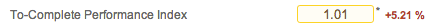 To-Complete Performance Index | To-Complete Performance Index (TCPI) determines the efficiency (CPI) that must be achieved on the remaining work for a project to meet the Budget at Completion. It is computed by dividing the work remaining (BAC - EV to date) by the budget remaining (BAC - AC to date). A value greater than one indicates that the performance must improve. TCPI is undefined if the BAC is 0 or if AC is greater than BAC. |