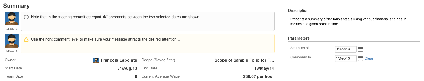 If you entered comments in the folio or portfolio overview or in one of their summary screens, they will be displayed in the Steering Committee Report. If you did not specify any date in the field 'Compare to', only the latest comment with a date equal or before to the date you specified in the field 'Status as of' is displayed.