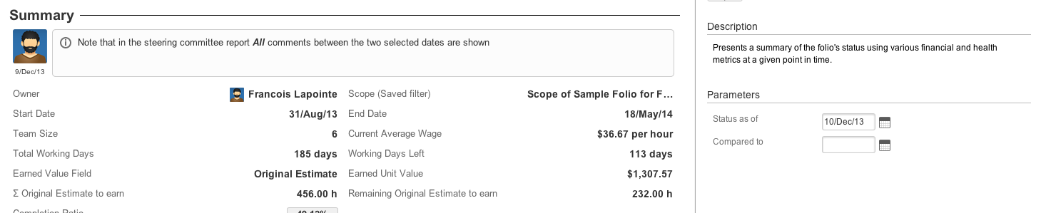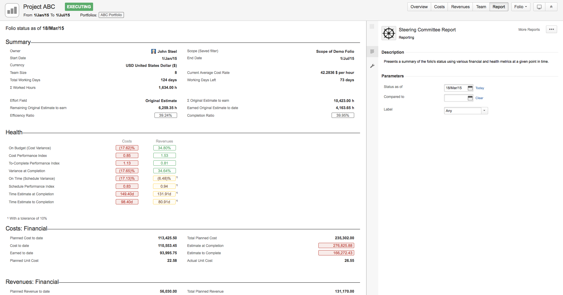 The Steering Committee Report presents a summary of the folio's status at a given date. It shows the same financial and health metrics provided by the folio's Overview, but in greater detail, calculated for the specified date. To access this report, click the Report tab (or hit '6') to display the Available Reports view, then click the 'Show report' button next to the Steering Committee Report preview. The report is generated using today's date as default. You can change the date in the 'Status as of' field at the right. The report is automatically refreshed when the date changes.
