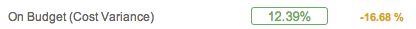 On Budget (Cost Variance) | Cost Variance (CV) determines if the project is under or over the budget. It is computed by subtracting the Actual Cost from the Earned Value divided by the Earned Value. A negative value indicates that the project is over budget. |