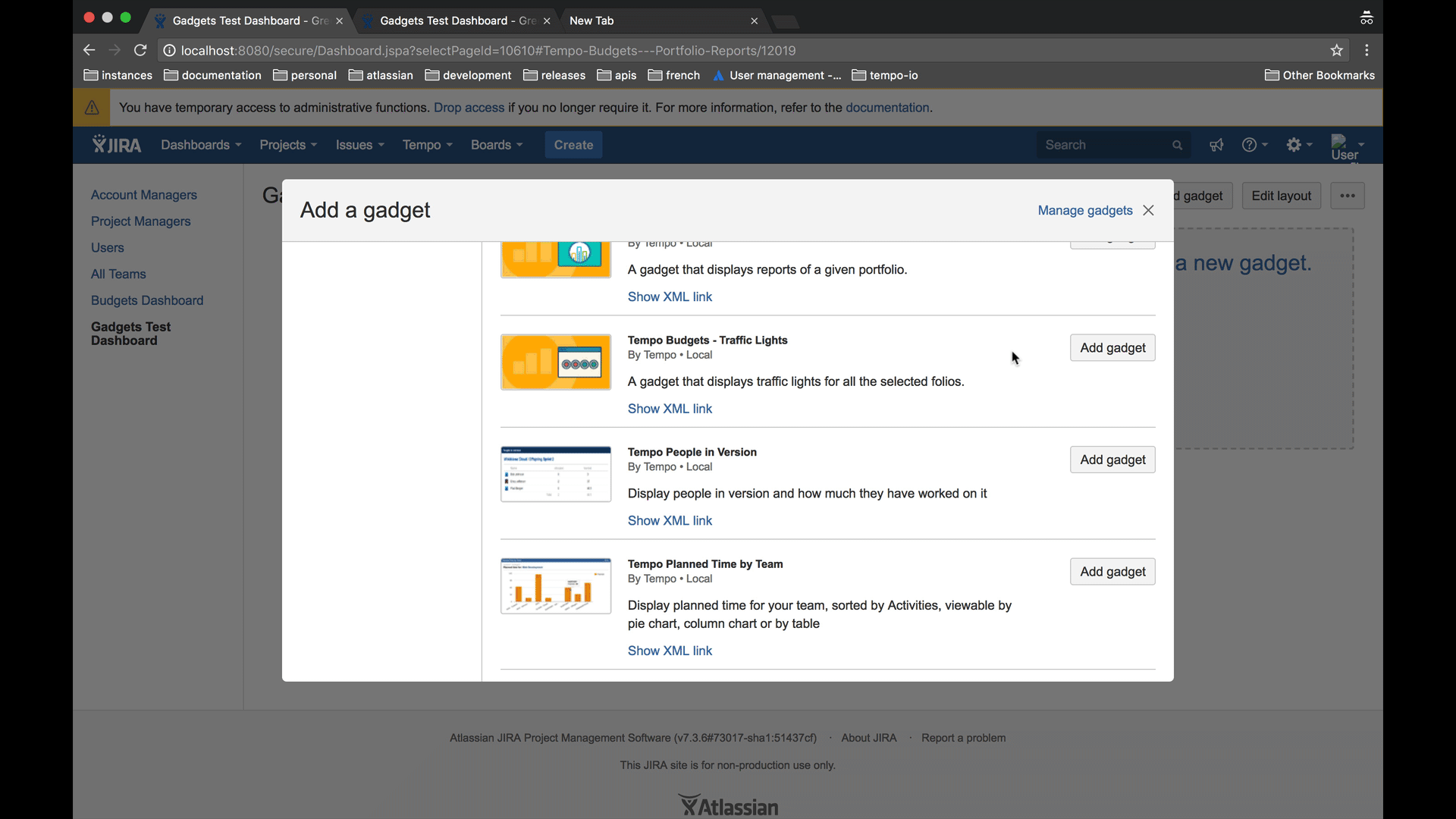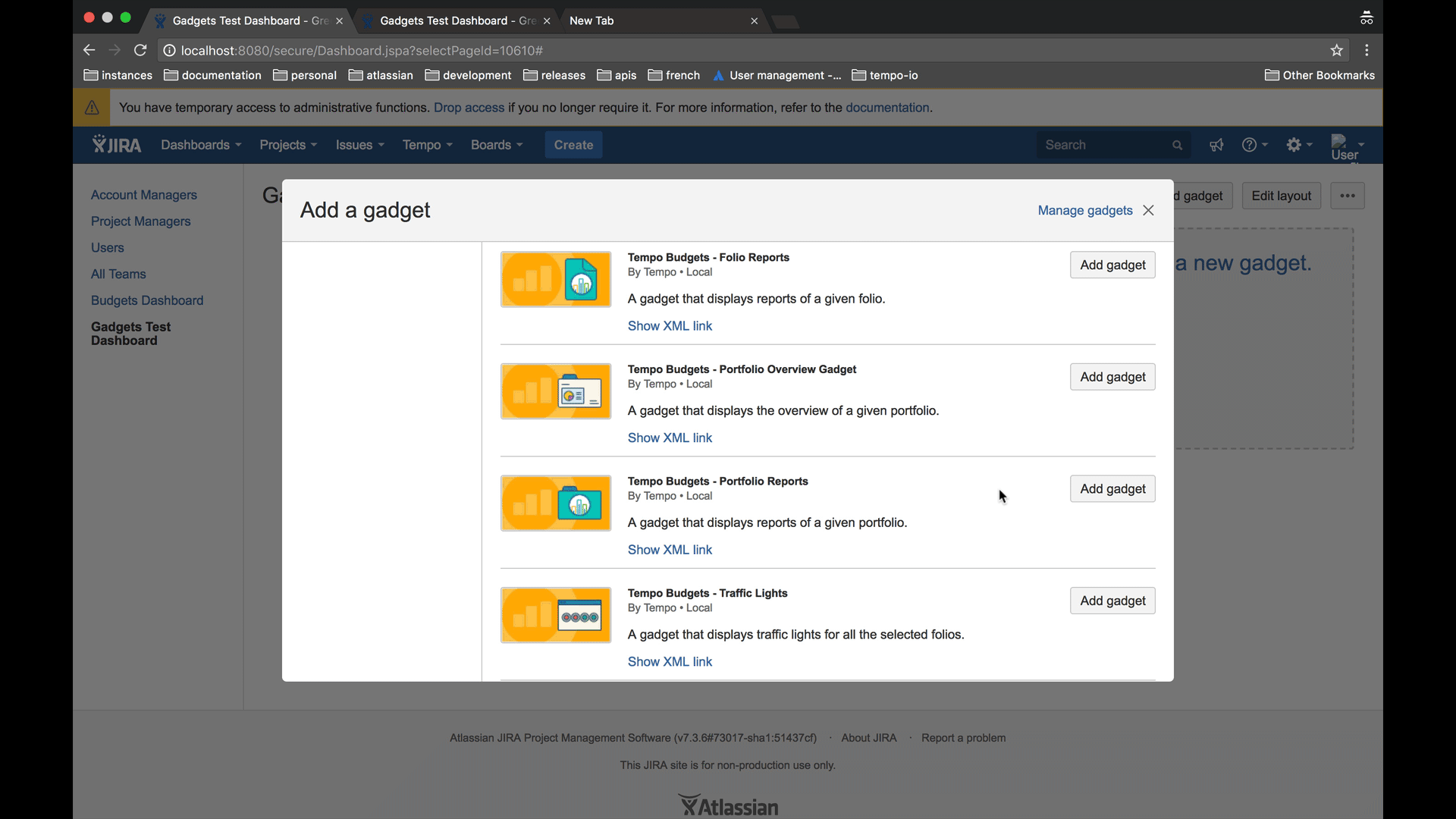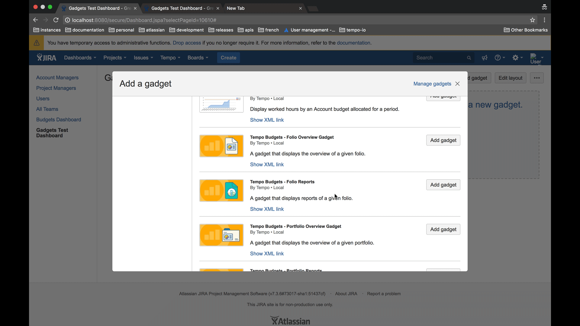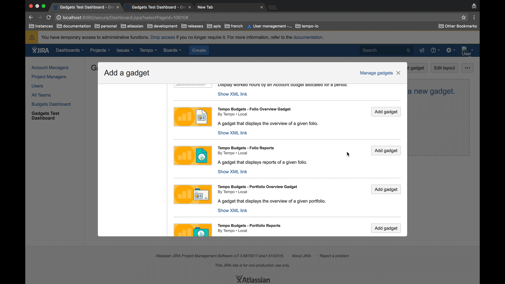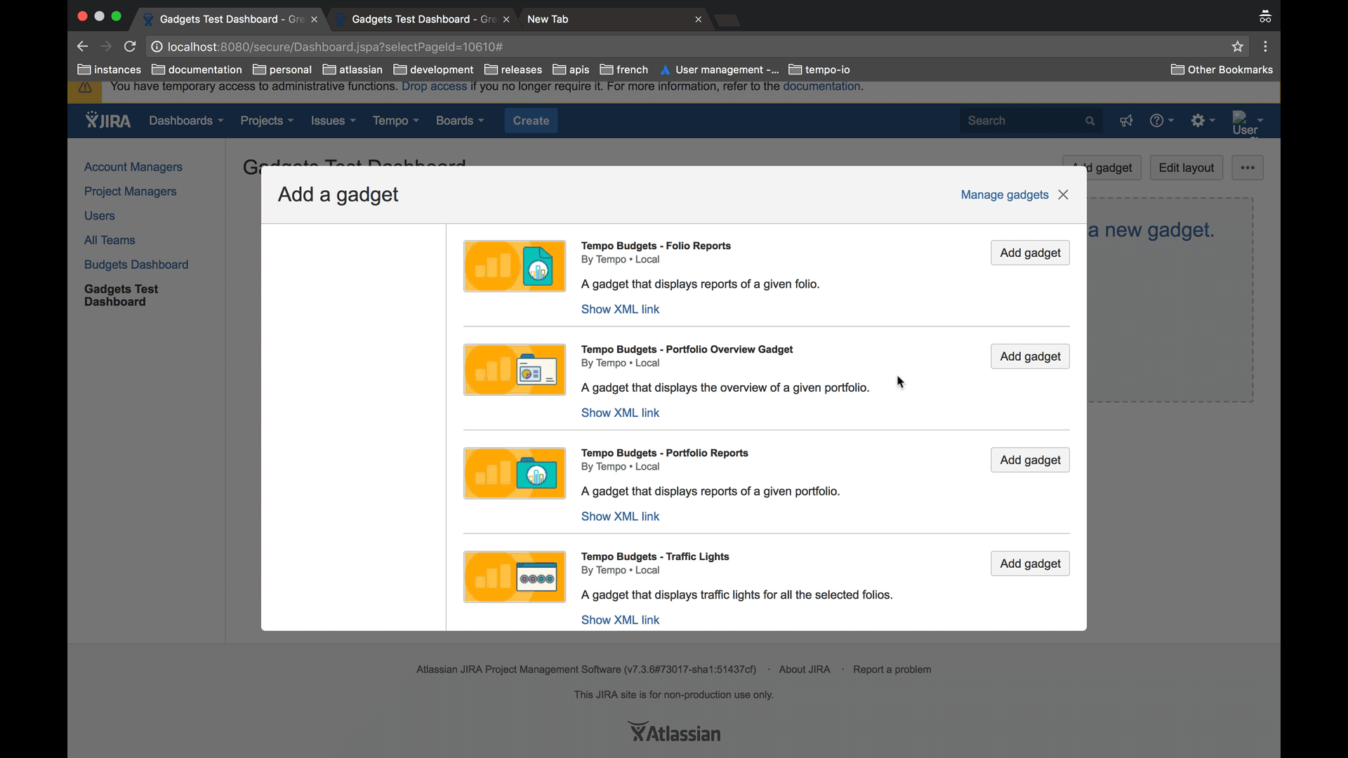 Tempo Budgets includes a number of gadgets that you can add to your Jira Dashboards to quickly summarize information from Budgets. Each gadget can be configured to display a variety of information about your folios or portfolios.