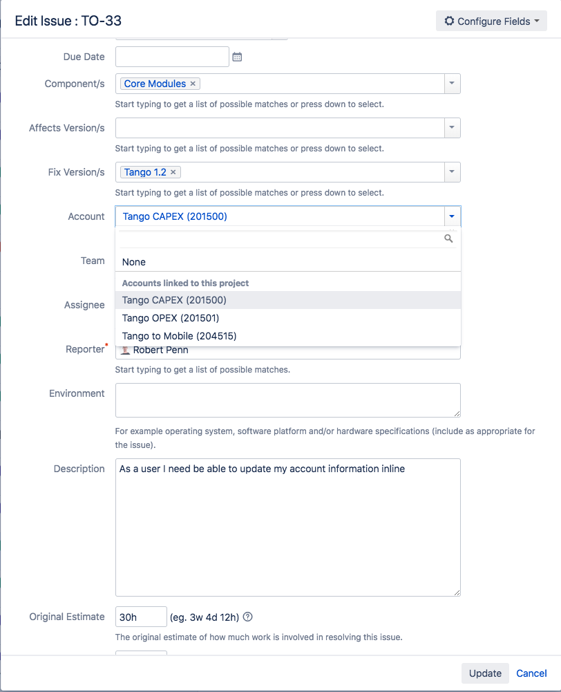 The Tango OnDemand project is now linked to your billable and non-billable accounts. Now link individual issues to your billable and non-billable accounts, and then log some time to the issues.