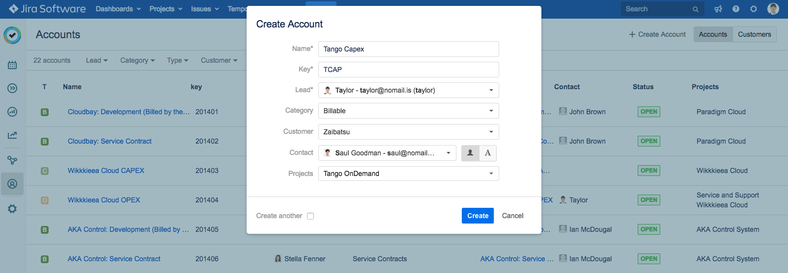 Now you have billable and non-billable accounts connected to your customer. If you did not link the accounts to a Jira project upon creation, you can now link them to the Jira project that you will be working on for this customer. Link both your Tango Capex and Tango Opex accounts to the Tango OnDemand project.