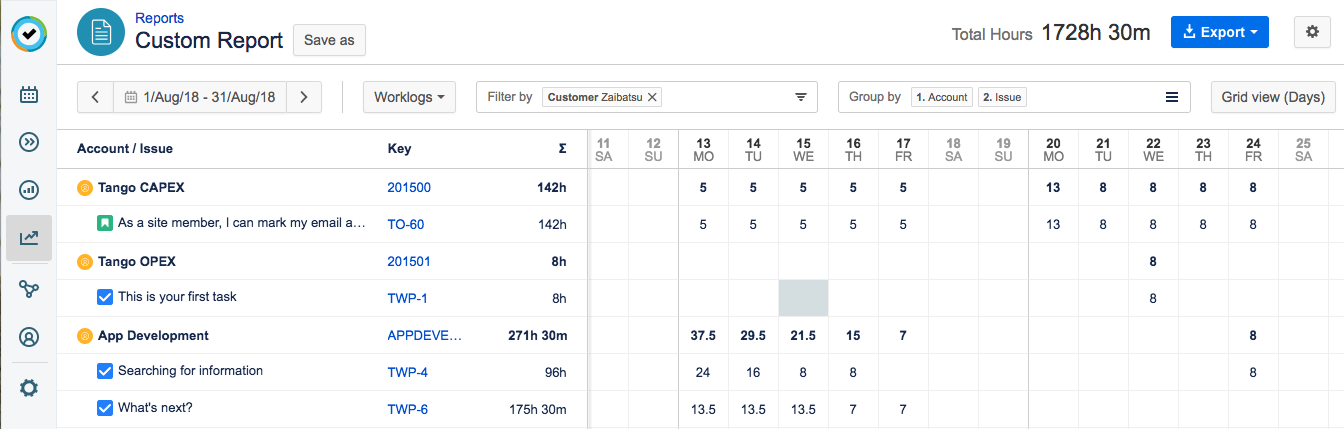 To view all hours spent on issues linked to each of the two accounts, billable and non-billable, simply generate a custom report, filter it by Customer, and group the information by Account. Finally export the data for invoicing.