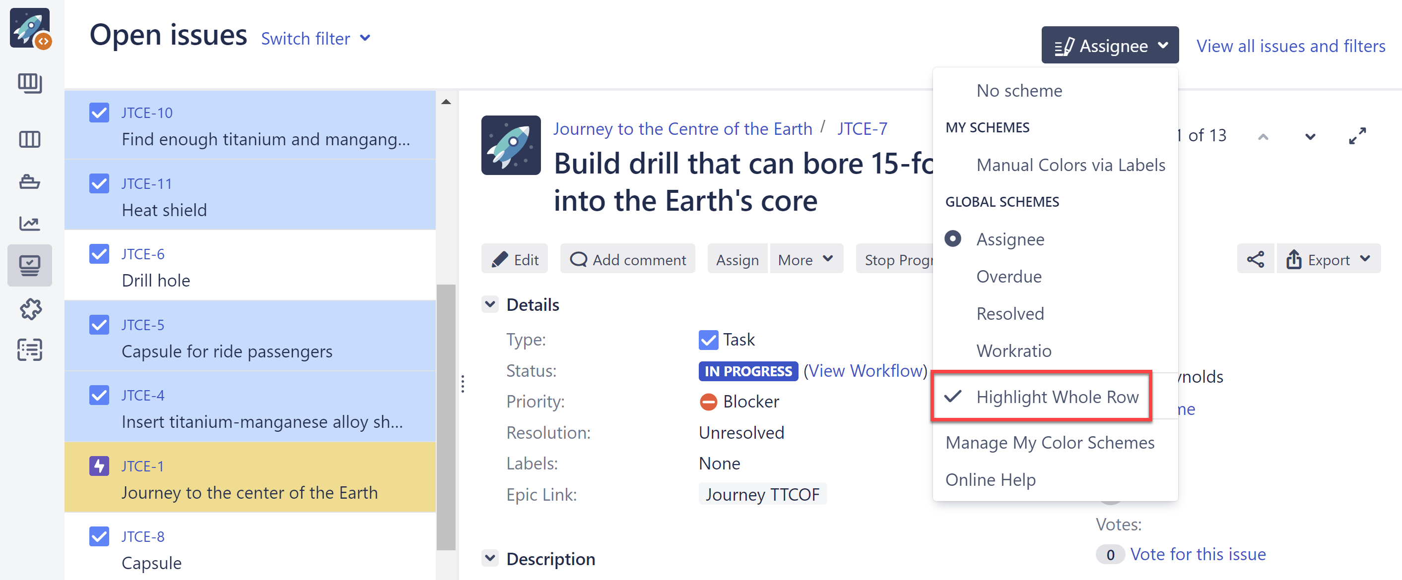 To change from one mode to the other, toggle the Highlight Whole Row option in the dropdown menu. The selected coloring mode applies to all Jira pages.