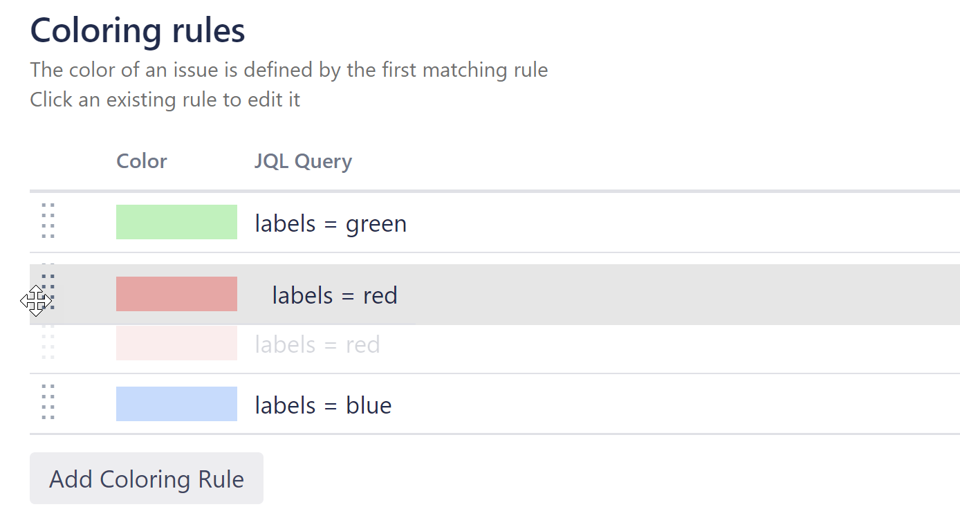 Each coloring rule consists of a JQL query and a color. The dialog only accepts valid JQL queries: