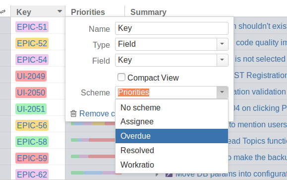 This column displays the issue key and adds a small colored tag around it, based on the assigned Color Scheme. Users can configure several Color Key columns, and each column can be assigned to a separate Color Scheme.