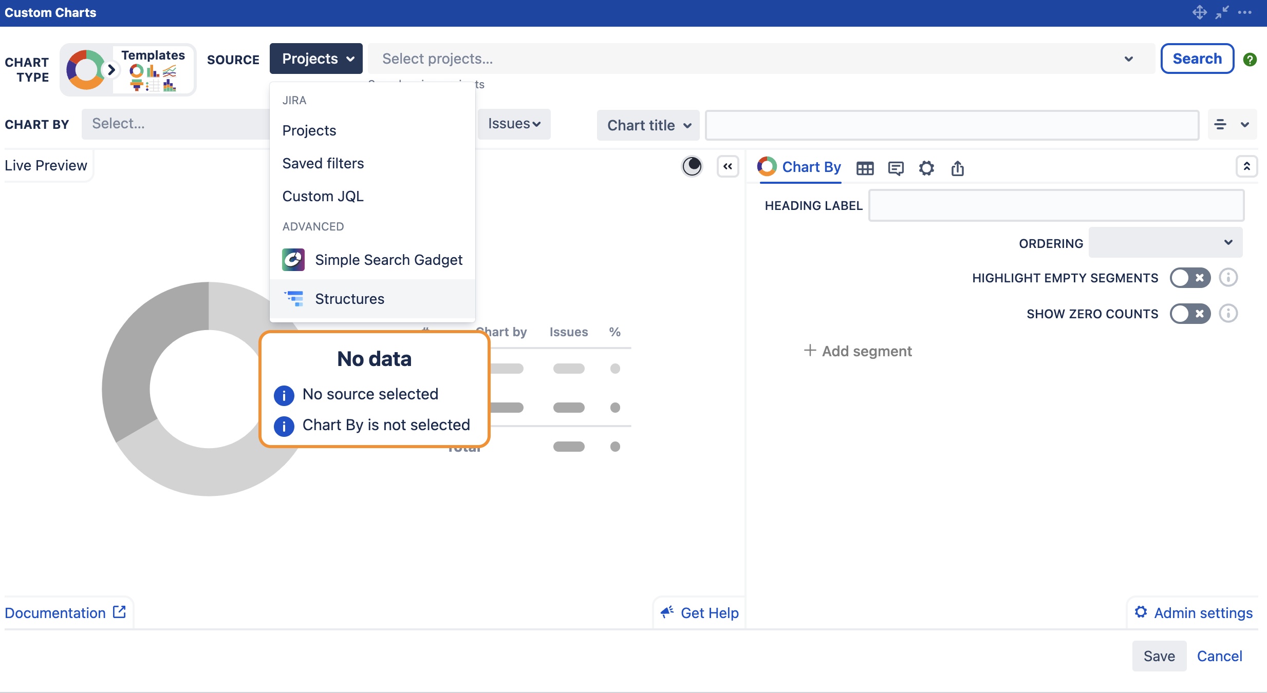 To connect a Custom Chart, Issue List, or Simple Search to Structure, simply set the Source to be Structures and choose the Structure(s) you want to pull in data from.